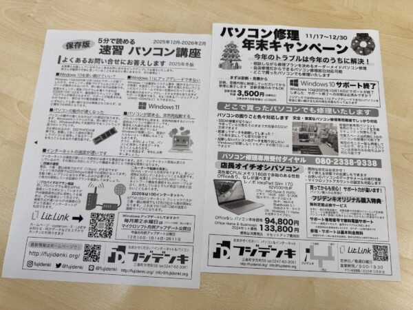 フジデンキでは、三春町内に折込チラシを配布しておりますが、その中で「保存版 5分で読める速習パソコン講座」という記事を掲載中です。