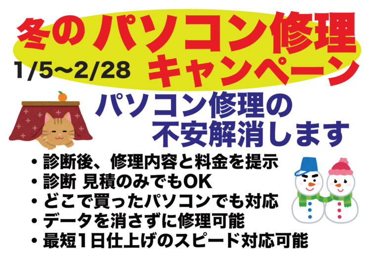 冬のパソコン修理キャンペーン 1/5〜2/28