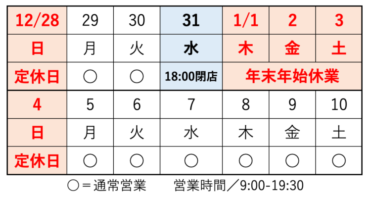 12月31日(水)9:00-18:00 ※閉店時間が18:00となります