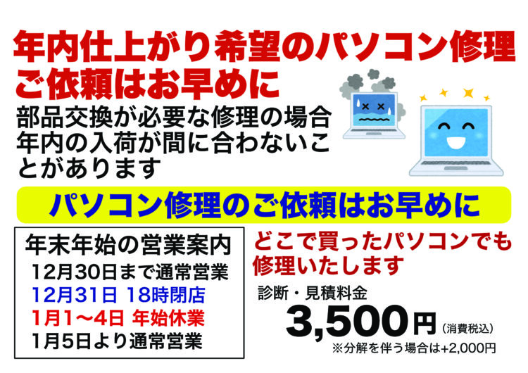年内仕上がり希望のパソコン修理があるお客様は、できるだけお早めに依頼していただきますようお願いいたします。