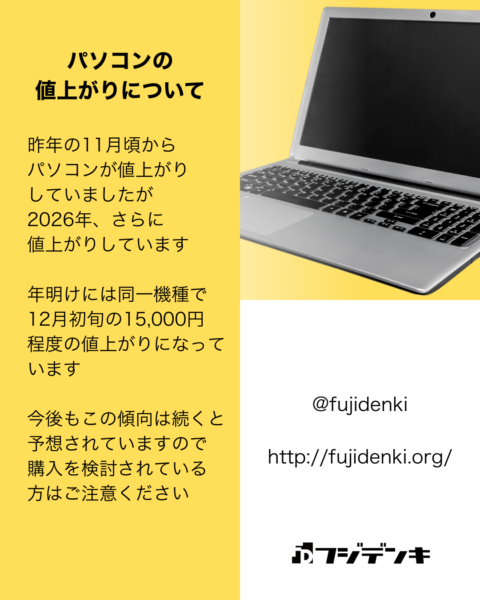 2026年は予想通り、パソコン値上がりが続く模様。早々に値上がりの通知が入ってきました。 2026年もパソコン値上がりは続く 昨年の11月頃からパソコンが値上がりしていましたが、2026年、さらに値上がりしています。年明 […]