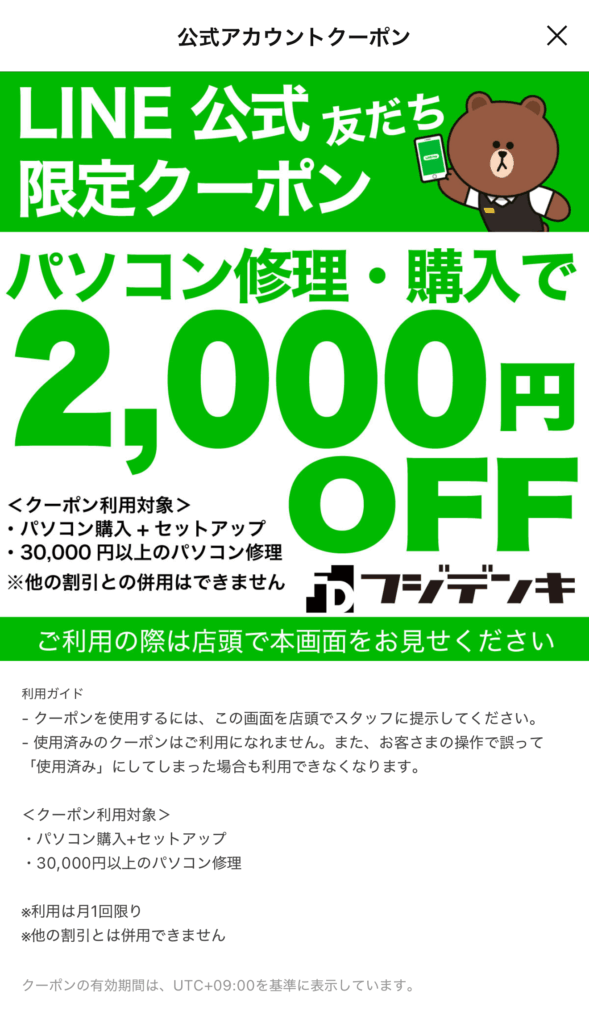 フジデンキでは、LINE公式アカウントでお得なクーポンを配布しています。