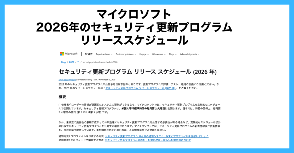 おすすめ2025年12月10日マイクロソフト 2026年のセキュリティ更新プログラム リリース スケジュール