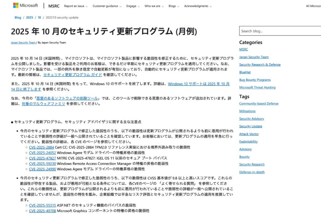 > 2025 年 10 月のセキュリティ更新プログラム (月例)(マイクロソフト)