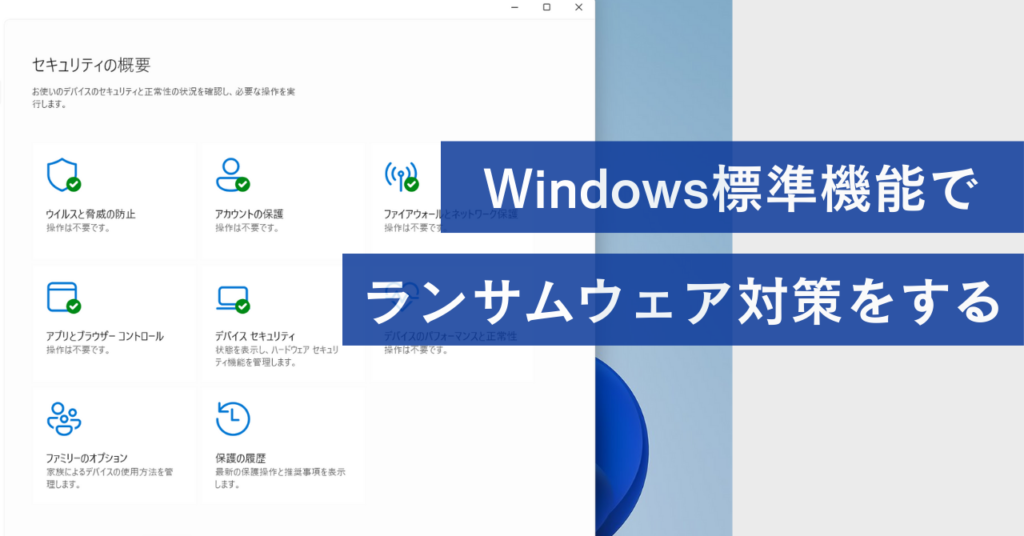 Windowsのセキュリティ対策ソフト「Windowsセキュリティ」にはランサムウェア対策機能があります。