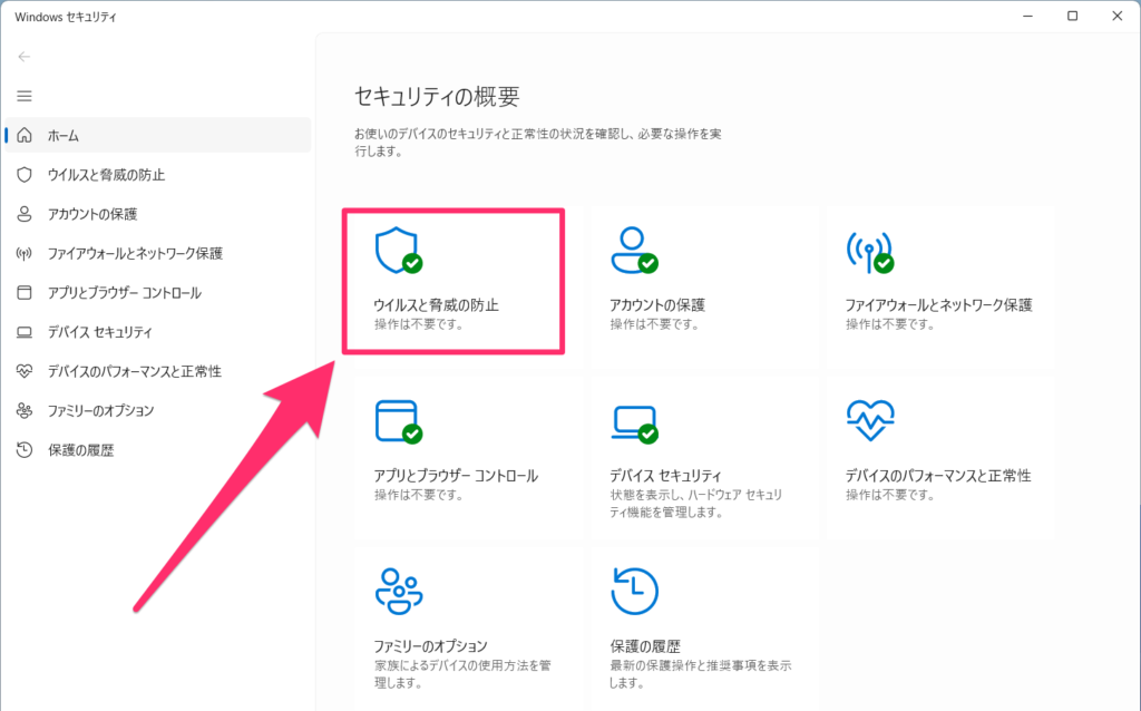 Windowsセキュリティのホームにある ウイルスと脅威の防止 をクリックします。