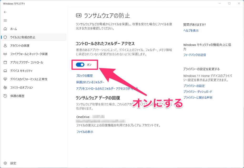 ランサムウェアの防止 にある コントロールされたフォルダーアクセス をオンにします。