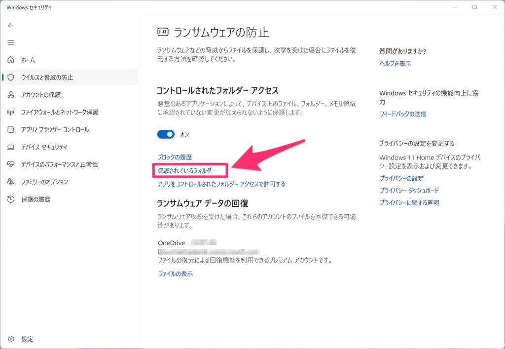 これでWindowsセキュリティでのランサムウェア対策が設定できました。