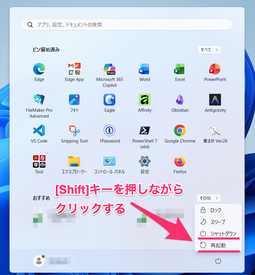 • Shiftキーを押しながら再起動をクリック・・・完全シャットダウン後再起動しメニュー表示
