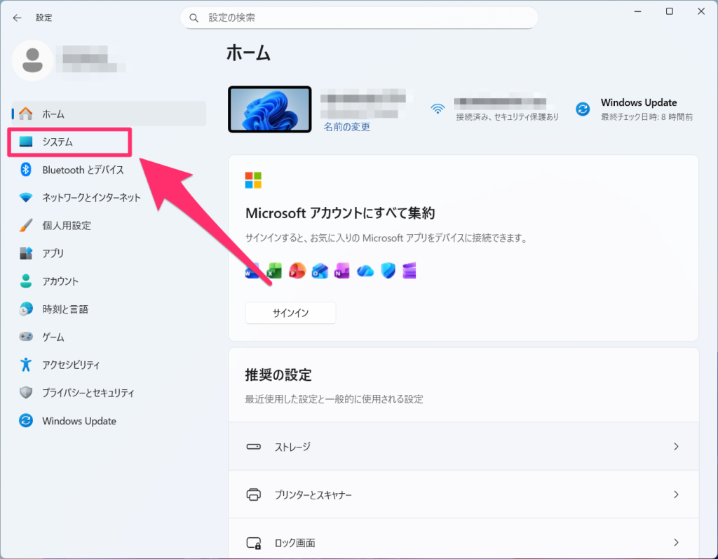 設定アプリを開き、左側のメニューのシステムをクリックします。