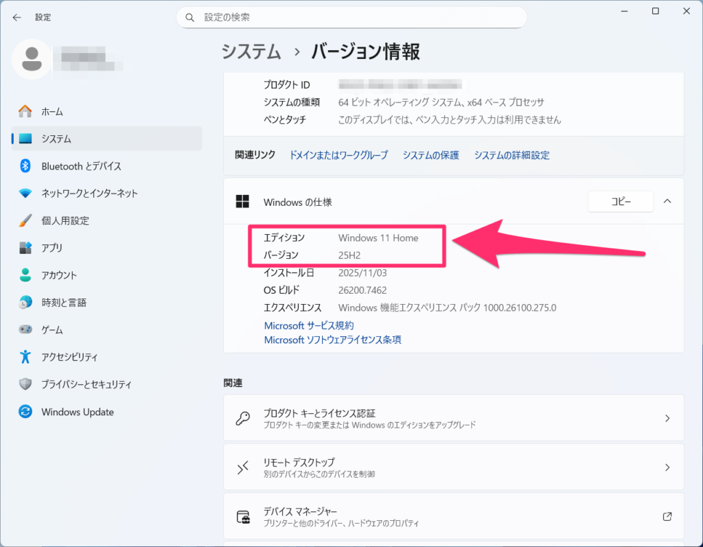Windowsのバージョンは設定のバージョン情報で確認できます。