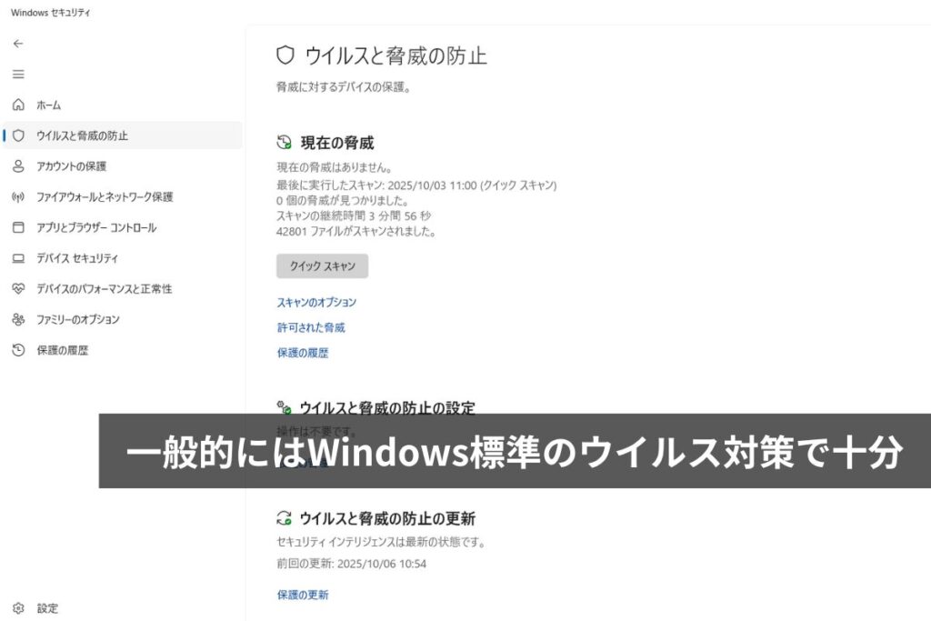 Windows 10以降、マイクロソフトはWindowsセキュリティを標準装備しており、そのウイルス検知能力は市販のセキュリティソフトに劣らない能力を持っており、業務用も含めて十分信頼に足るウイルス対策ソフトになっています。
