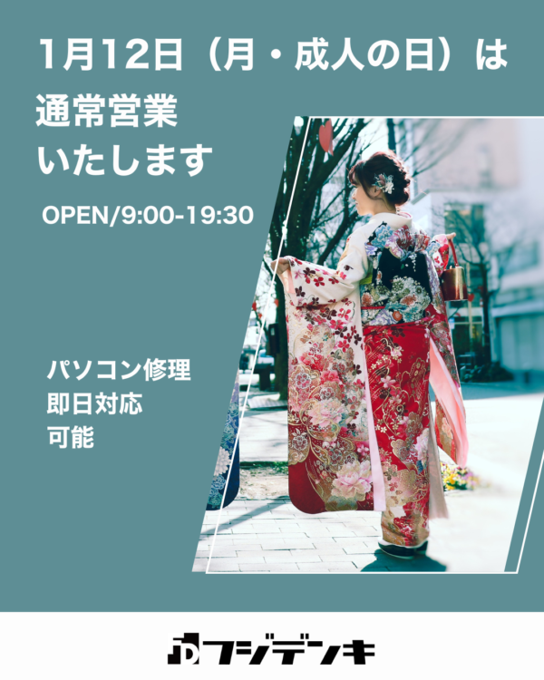 1月12日(月・成人の日)は通常営業いたします 2026年1月8日 最終更新日時 : 2026年1月8日 菊地@フジデンキ フジデンキは祝日は通常営業。1月12日(月・成人の日)も通常営業いたします。 1月12日(月・成人の日)は通常営業いたします 1月12日(月・成人の日)は通常営業いたします。 営業時間/9:00-19:30 いいね or フォローする @fujidenki FacebookXBlueskyHatenaCopy