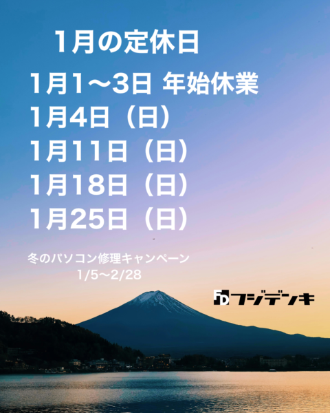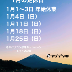 フジデンキから1月の定休日と営業案内です。 1月の定休日 1月の定休日 1月1〜3日 年始休業 1月4日(日)1月11日(日)1月18日(日)1月25日(日) ※1月12日(月・成人の日)は通常営業いたします 定休日/毎 […]