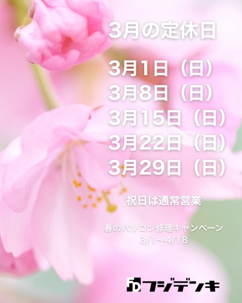 フジデンキから3月の定休日と営業案内です。 3月の定休日 3月の定休日 3月1日(日)3月8日(日)3月15日(日)3月22日(日)3月29日(日) ※3月16日(月)は店長不在のためパソコン修理即日対応不可※3月20日 […]